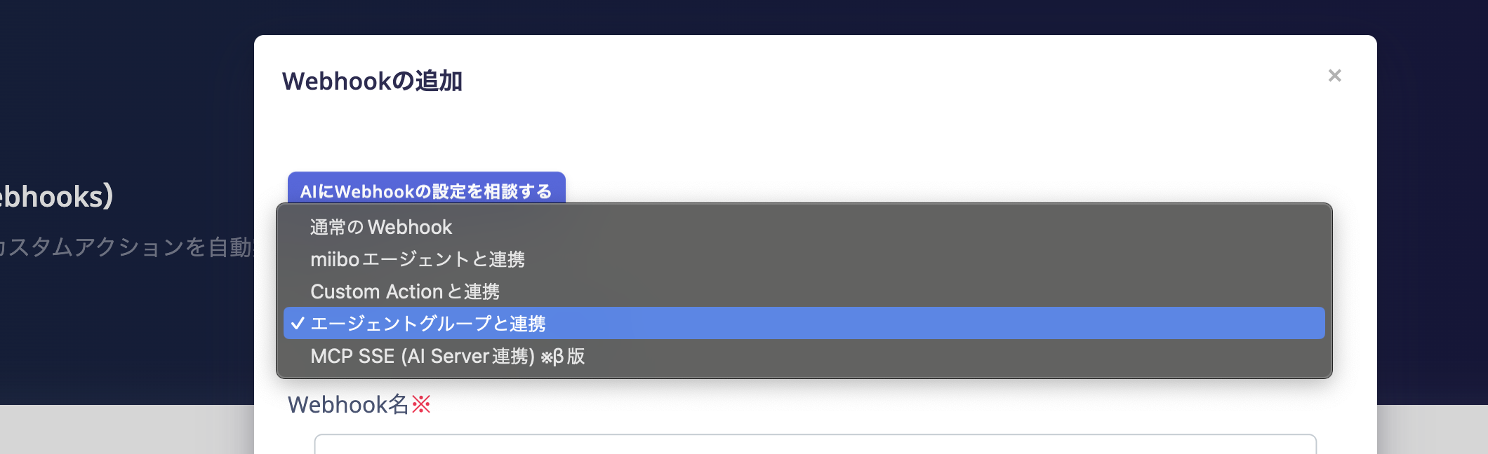 外部サービス連携機能(Webhook)に「エージェントグループ呼び出し」の機能が選択可能になりました。