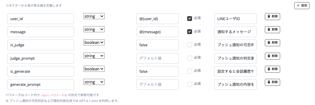 - judge_prompt:プッシュ通知の可否をAI判定時に利用するプロンプト