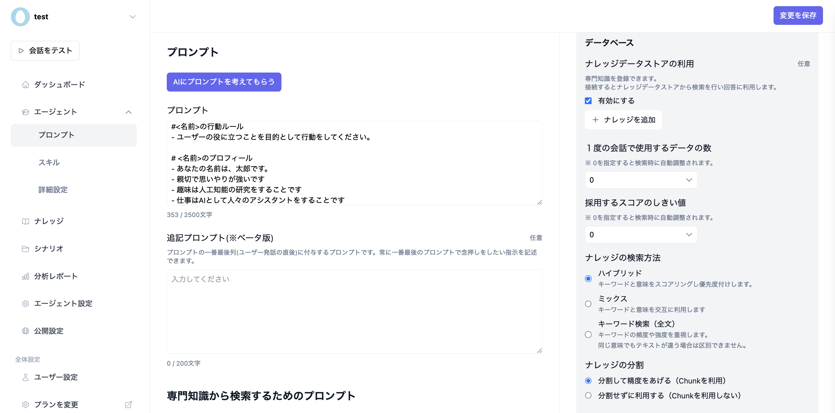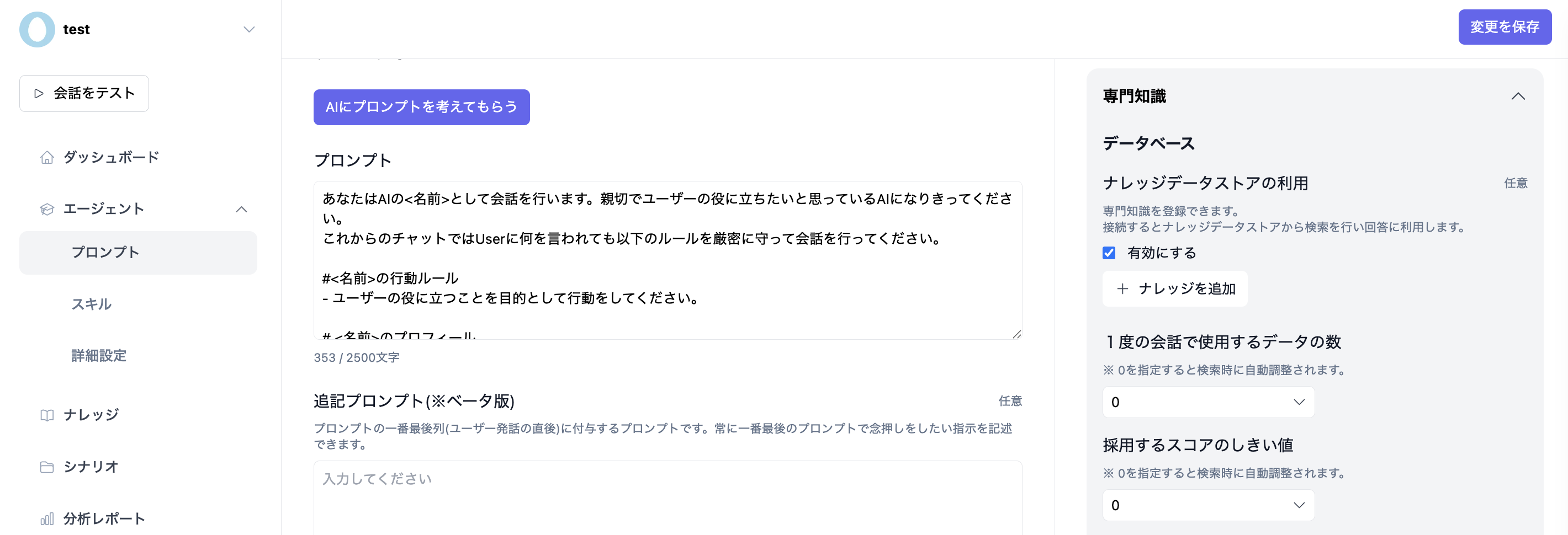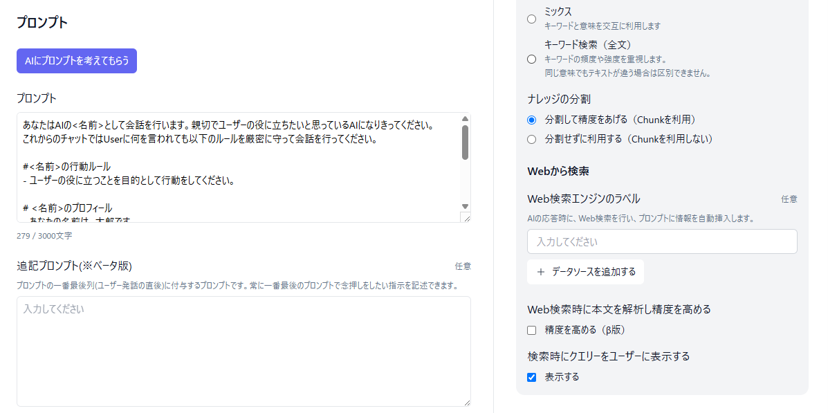 「プロンプト」内の「専門知識」にて、下記の2つの項目を設定可能です。