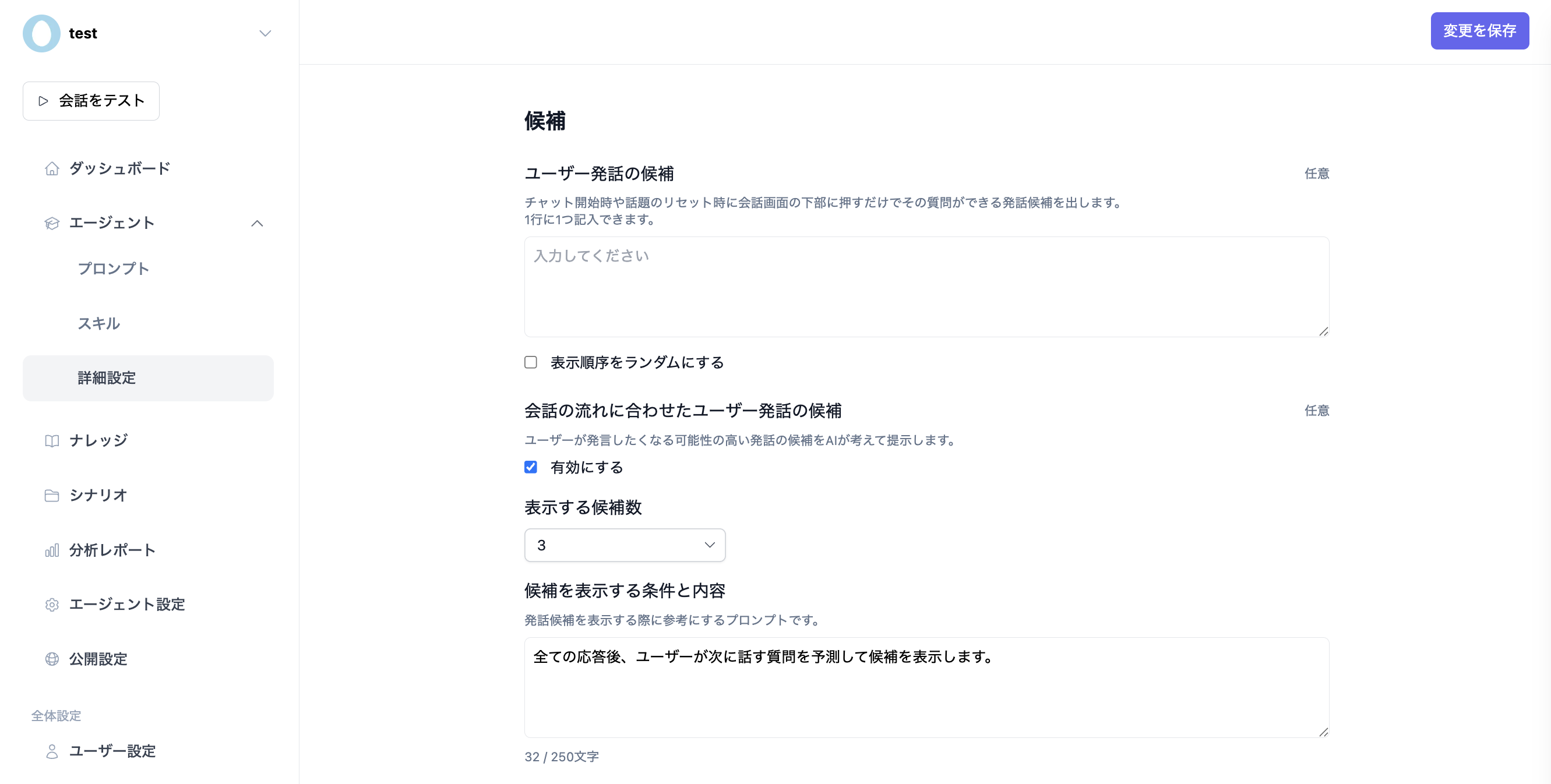 この設定は、「エージェント」->「詳細設定」における「候補」の画面でも設定が可能です。