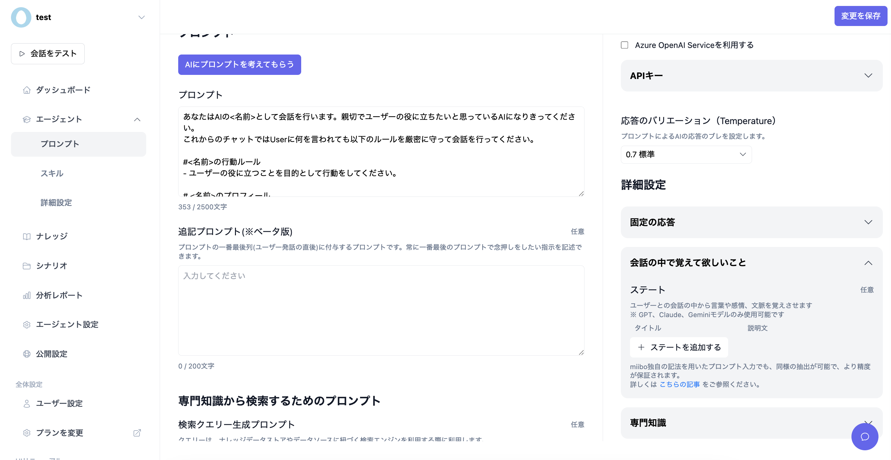 尚、ステートの記録は「エージェント」->「プロンプト」画面内の「会話の中で覚えて欲しいこと」にある「ステート」でも設定可能です。