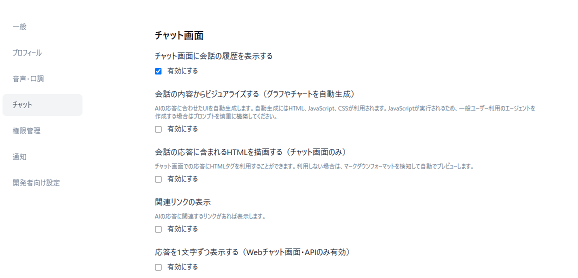 エージェントの応答に含まれるHTMLタグを実際に描画し、リッチなコンテンツ表示を可能にします(チャット画面のみ)。