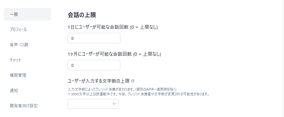 - 1日の会話回数上限: 1日にユーザーが可能な会話回数(0 = 上限なし)