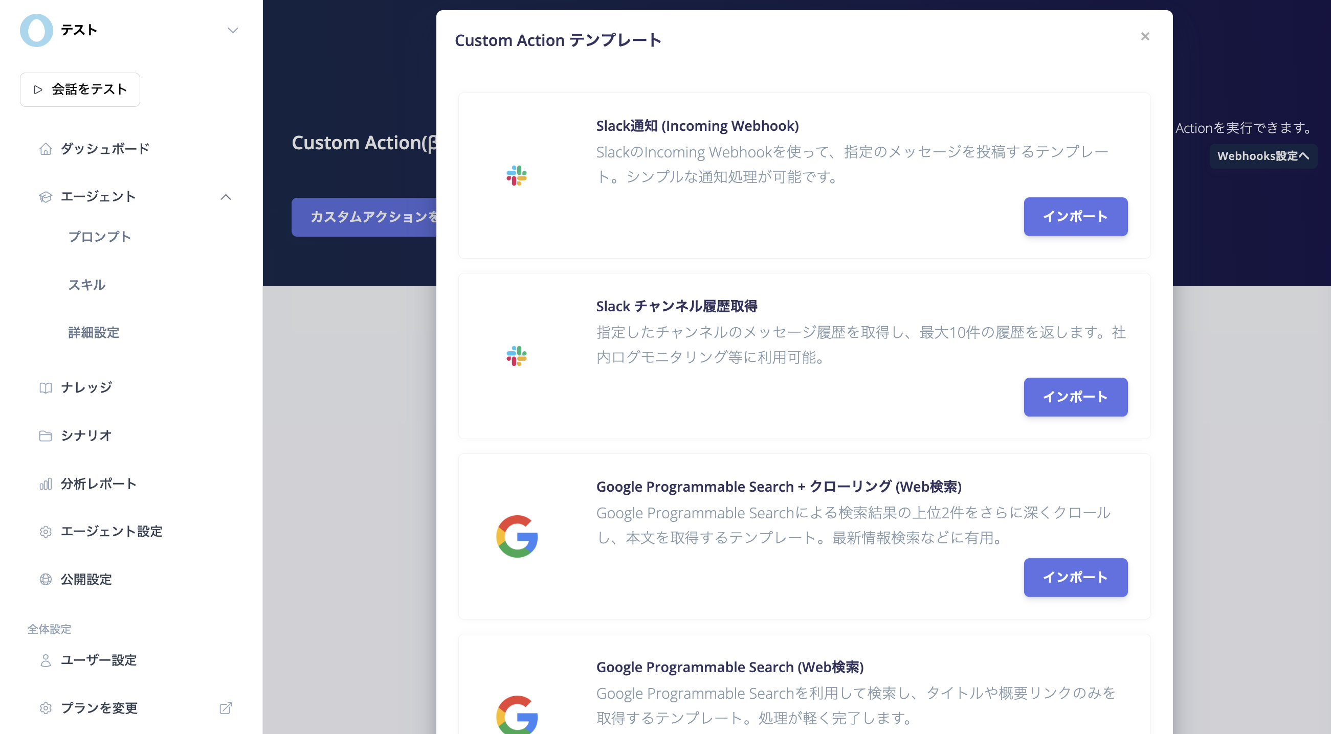 - 目的の機能に合ったテンプレートの「インポート」ボタンをクリック