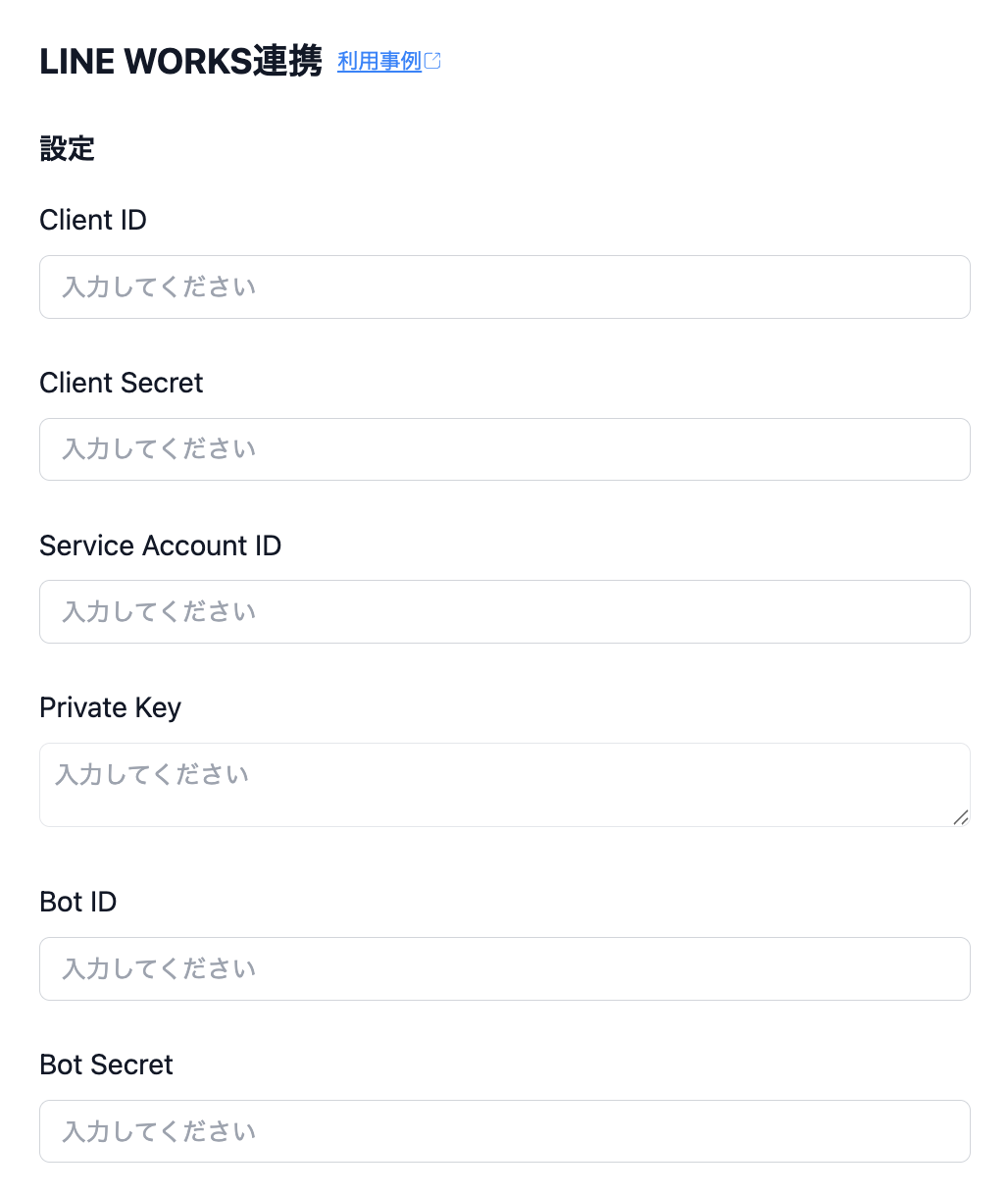 上記を入力し終えたら、「LINE Worksと連携する」をクリックしてください。