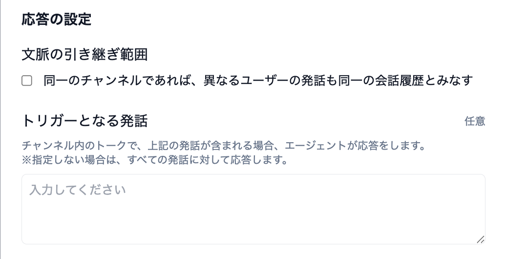 一方、「同一のチャンネルであれば、異なるユーザーの発話も同一の会話履歴とみなす」をONにしておくと、複数人のトークルームの会話履歴を同一のものとして扱います。