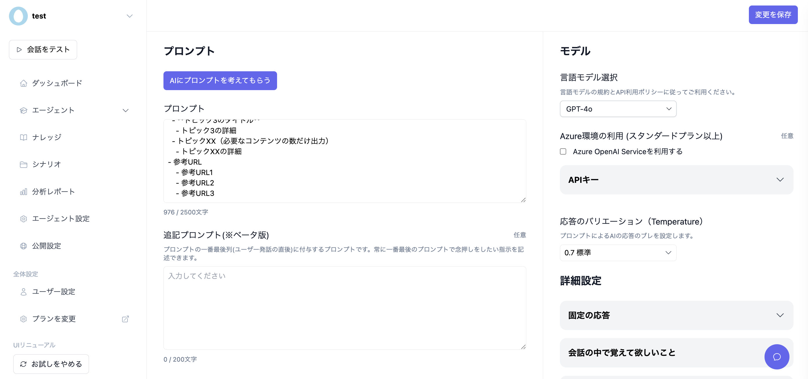 左メニューの「エージェント」->「プロンプト」から、AIの応答の設定を行うことができます。