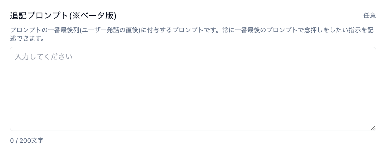 プロンプトの最後に追加されるプロンプトです。 miibo上で設定が可能です。