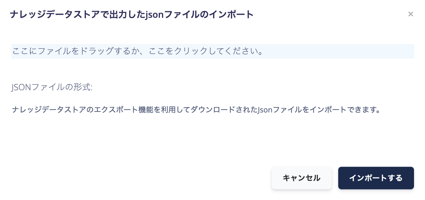 フォーマット指定のJsonファイルのインポートは、他のナレッジデータストアからエクスポートされたデータをインポートするために利用します。