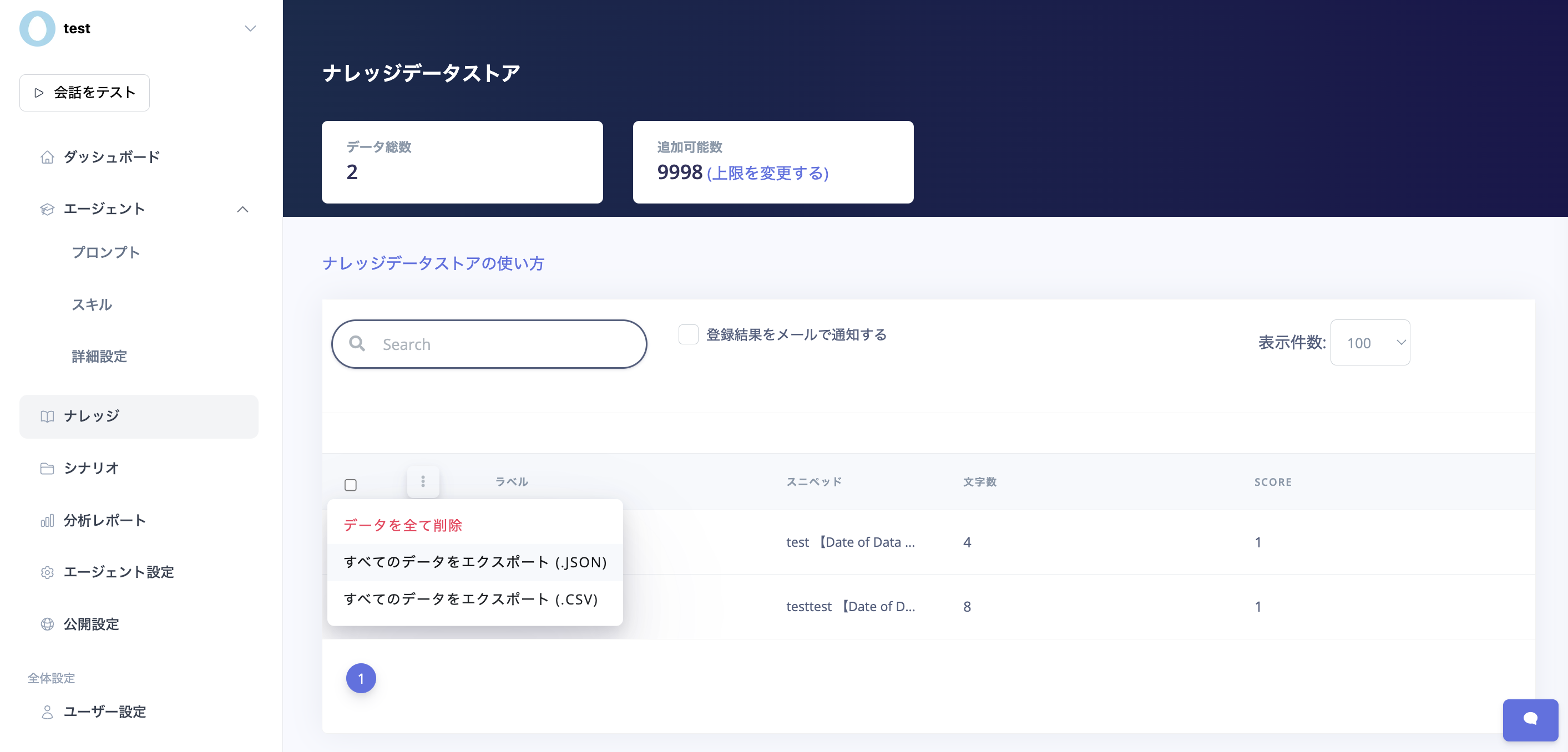 この「すべてのデータをエクスポート」ボタンで、ナレッジデータストアのデータをJson形式でエクスポートできます。(バックアップやエージェント間のデータ移行にご活用いただけます。)