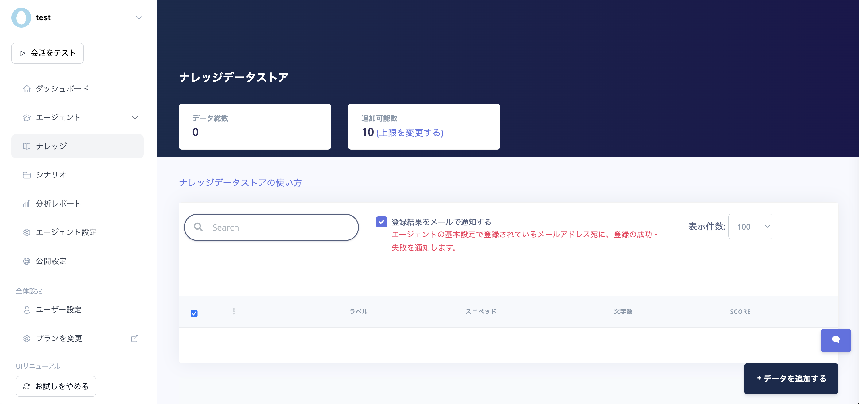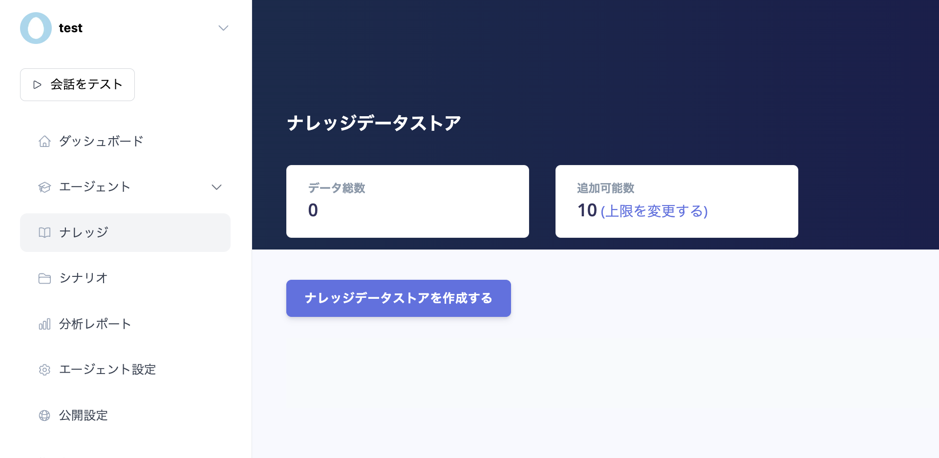 左メニューから「ナレッジ」を開きましょう。 初回のみ、「ナレッジデータストアを作成する」をクリックする必要があります。