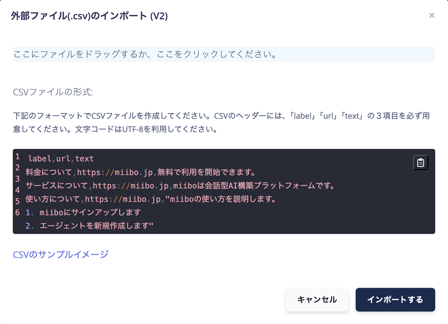 CSVのヘッダーには、「label」「url」「text」の3項目を必ず用意してください。 ※文字コードはUTF-8を利用してください。