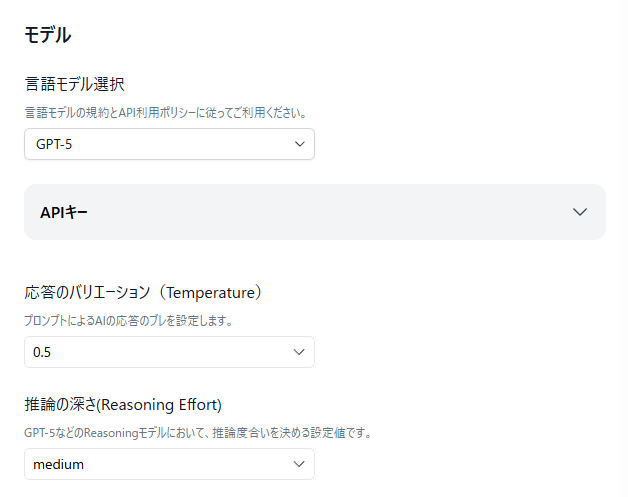 GPT-o1およびGPT-5モデルに対応した推論レベル(Reasoning Effort)の設定が可能です。エージェント設定でReasoning Levelを指定することで、AIの推論の深さを調整できます。「GPT-5」の応答が遅すぎてなかなか活用できない、といった場合は、「low」や「minimal」を指定いただくことで、よりレスポンスが高速なGPT-5を利用することができます。